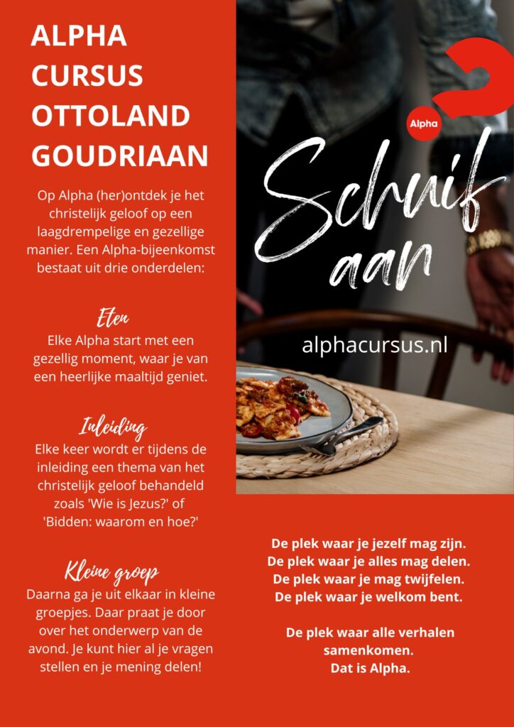 Vanaf donderdagavond 8 januari (aanvang eten om 18.30 uur) start er weer een nieuwe Alphacursus voor Goudriaan, Ottoland en daarbuiten! De Alphacursus is een mooie manier om je geloof te herontdekken en te verdiepen. De cursus bestaat uit elf donderdagavonden en een weekend (één overnachting). We beginnen iedere avond met een maaltijd, gevolgd door een inleiding over een thema van het christelijk geloof. In kleine groepjes is er daarna voldoende ruimte om je eigen mening te vormen of om gewoon te luisteren. De Alphacursus vindt plaats in de Bogerd in Ottoland.