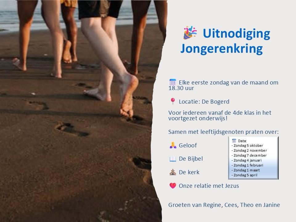 As zondagavond 5 oktober start de jongerenkring weer. Zie de uitnodiging hieronder. De eerste avond zal gelijk een speciale avond worden, dus zorg ervoor dat je erbij bent.