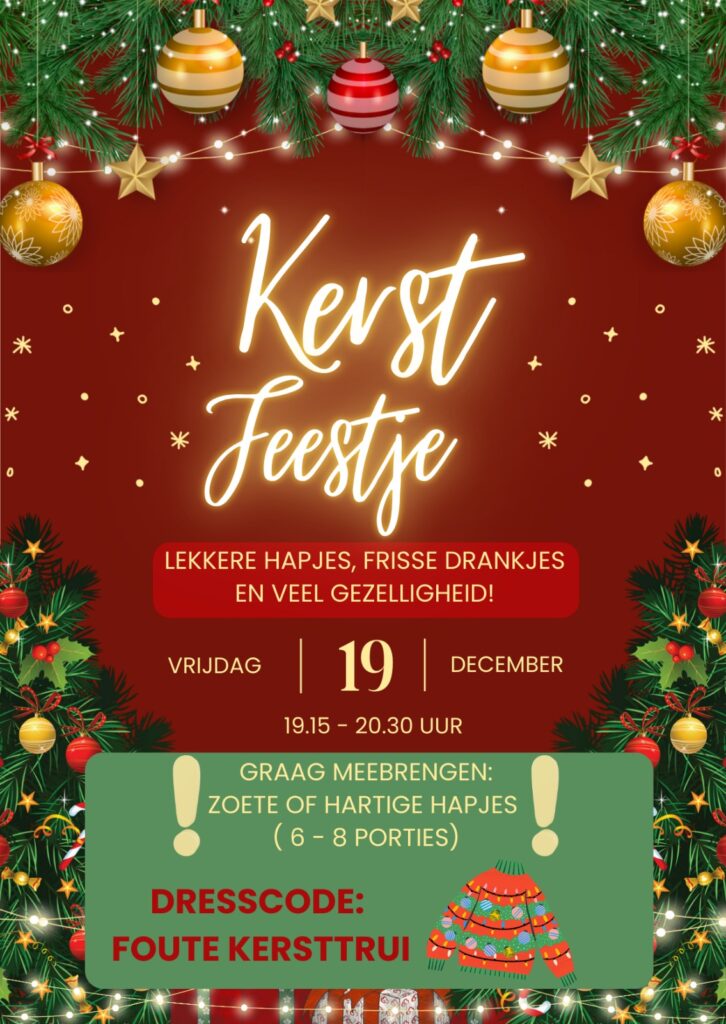 Wanneer: Vrijdag 19 december Tijd: 19.15 uurLocatie: De BogerdDresscode: Foute kersttrui 🎄