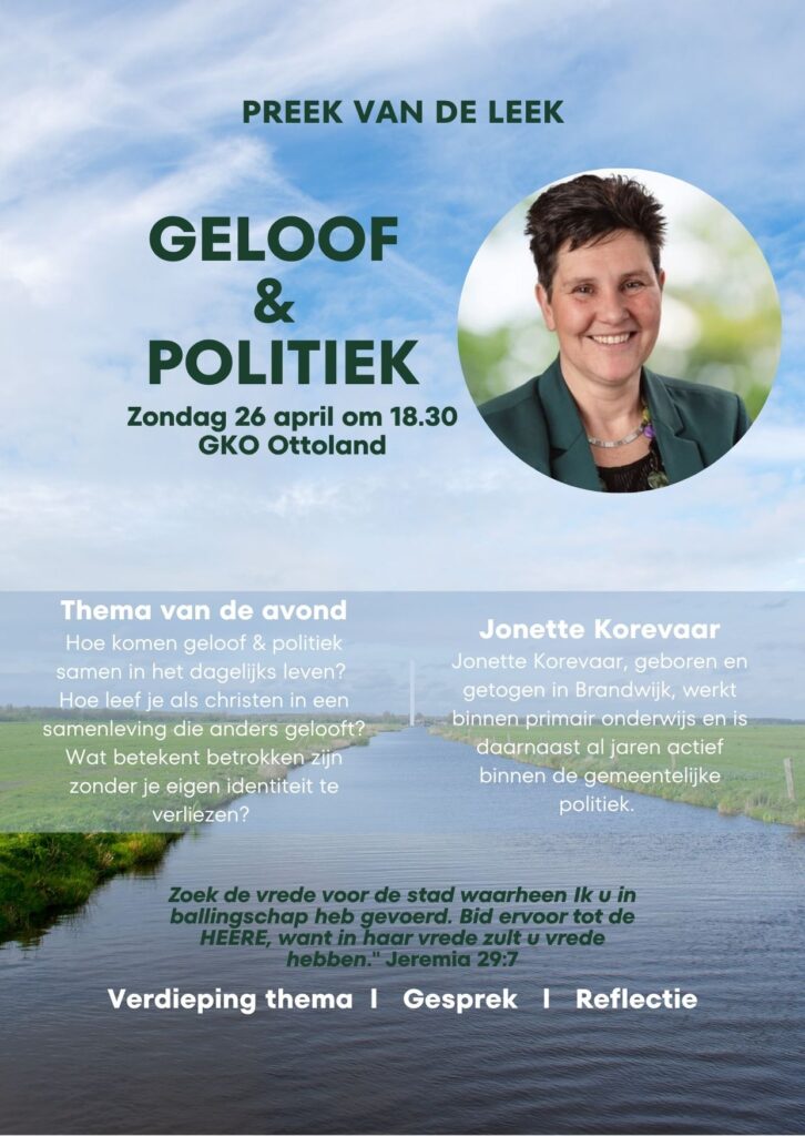 Jonette Korevaar, geboren en getogen in Brandwijk, werkt binnen primair onderwijs en is daarnaast al jaren actief binnen de gemeentelijke politiek. Komende zondagavond om 18.30 zal zij ons meenemen in hoe geloof en politiek samenkomt. Onderstaande tekst zal centraal staan in de dienst. Er zal stilgestaan worden bij vragen die veel mensen zullen herkennen: hoe leef je als christen in een samenleving die niet vanzelfsprekend hetzelfde gelooft? En wat betekent betrokkenheid zonder dat je je eigenheid verliest?